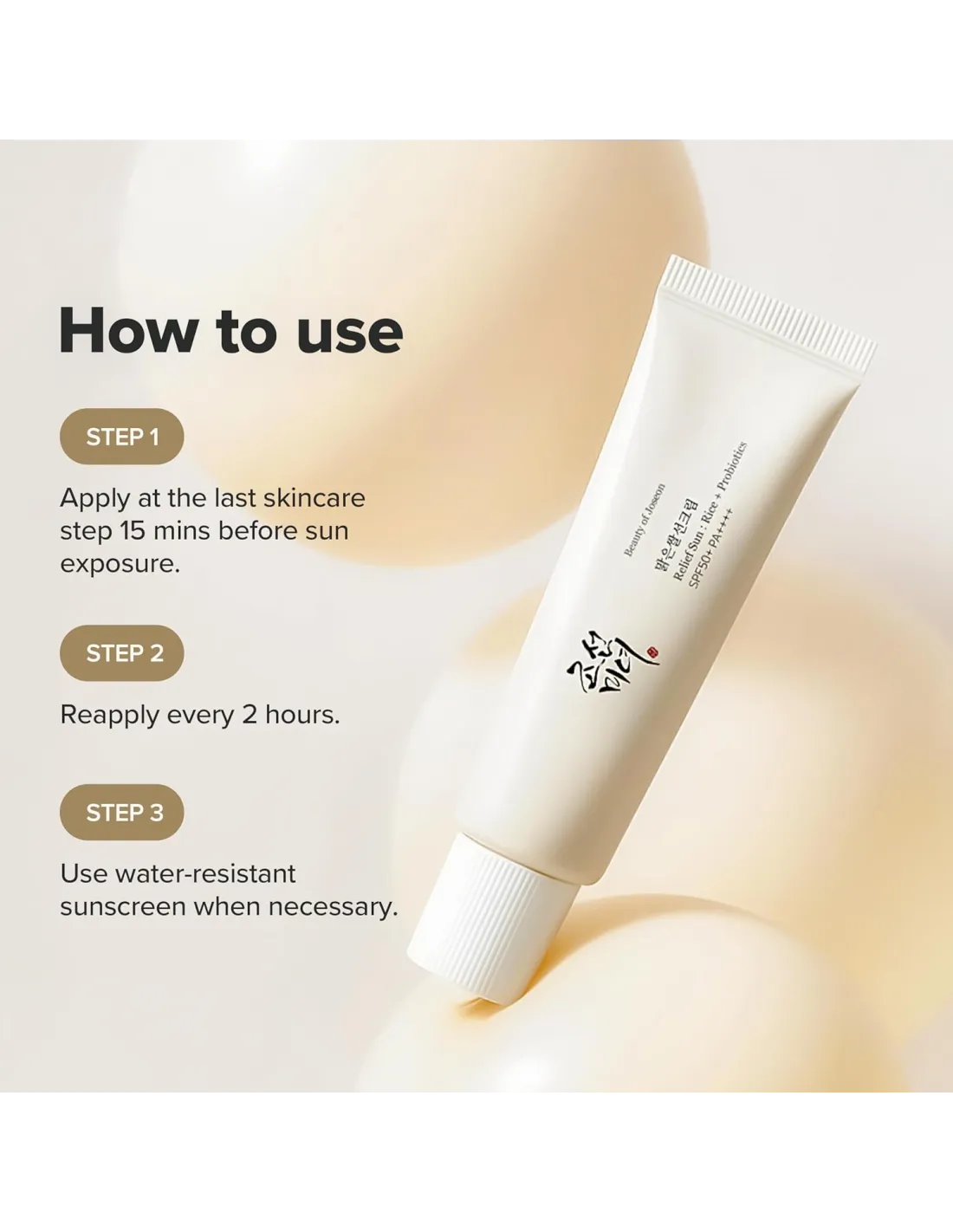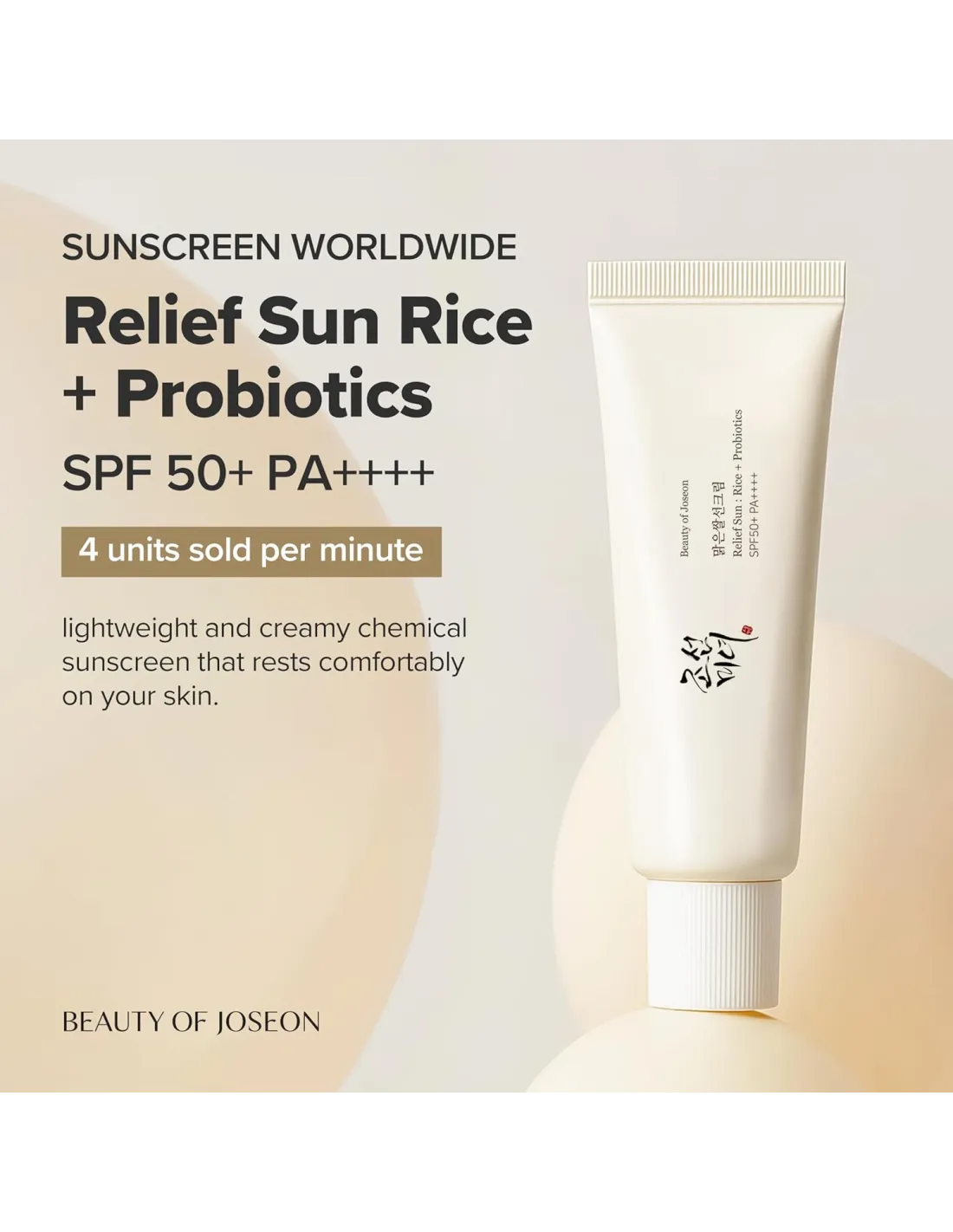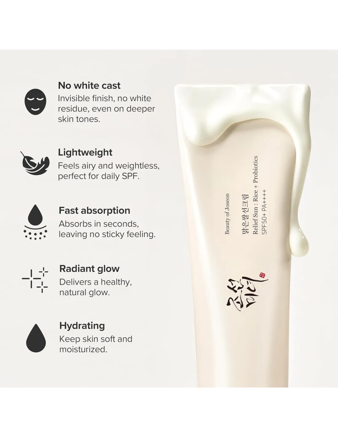 Beauty of Joseon Relief Sun är berikad med hela 30 % risextrakt och spannmålsfermenterade extrakt (probiotika) som tillsammans arbetar för att lugna, ge näring och stärka hudens naturliga barriär. Den innovativa formuleringen är rik på vitamin B, C och E samt mineraler som hjälper till att jämna ut hudtonen och ge en naturlig lyster.