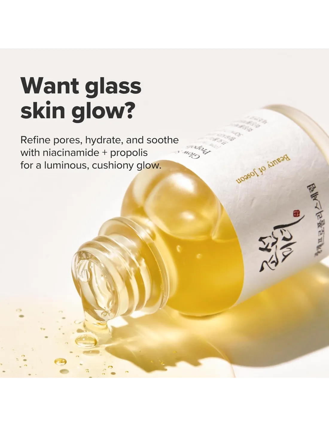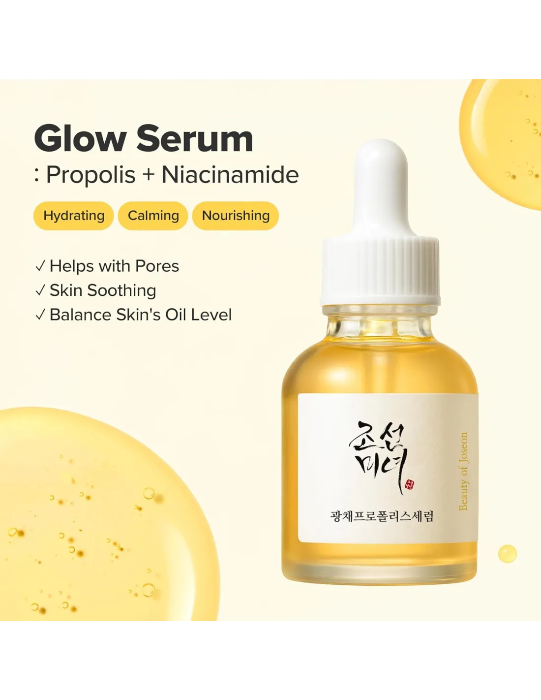 Beauty of Joseon Glow Serum Propolis + Niacinamide är ett lyxigt serum framtaget för att ge huden en omedelbar lyster och en jämnare hudyta. Med en unik kombination av propolisextrakt och niacinamid arbetar detta serum effektivt för att lugna irritation, balansera talgproduktionen och ge din hud det eftertraktade koreanska "glass skin"-resultatet.