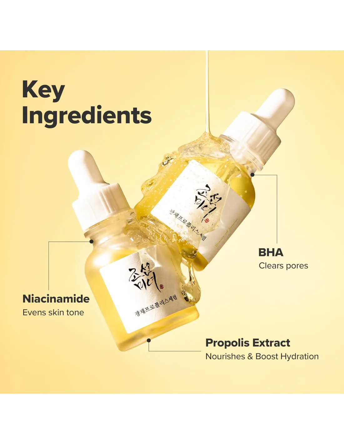 Formulan är berikad med 60 % propolisextrakt, som är naturligt antiseptiskt och antiinflammatoriskt, vilket gör det idealiskt för hud som dras med rodnad eller orenheter. 2 % niacinamid hjälper till att minimera porernas synlighet och jämna ut hudtonen. Den honungsliknande konsistensen absorberas snabbt utan att kladda och lämnar huden djupt återfuktad och strålande.
